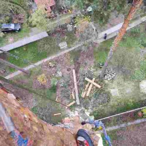 2. Спил с завешиванием. В этом случае альпинист обвязывает веревой каждую спилинную часть и, с помощью помощника на земле, аккуратно спускает части на землю в специально предусмотренное для этого свободный участок возле дерева.